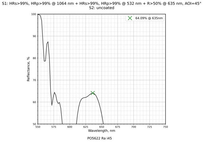 | 镀膜类型 | IBS镀膜 | 镀膜参数 | S1:HRs>99%,HRp>99%@1064nm+HRs>99%,HRp>99%@532nm+R>50%@635nm / S2:Uncoated |