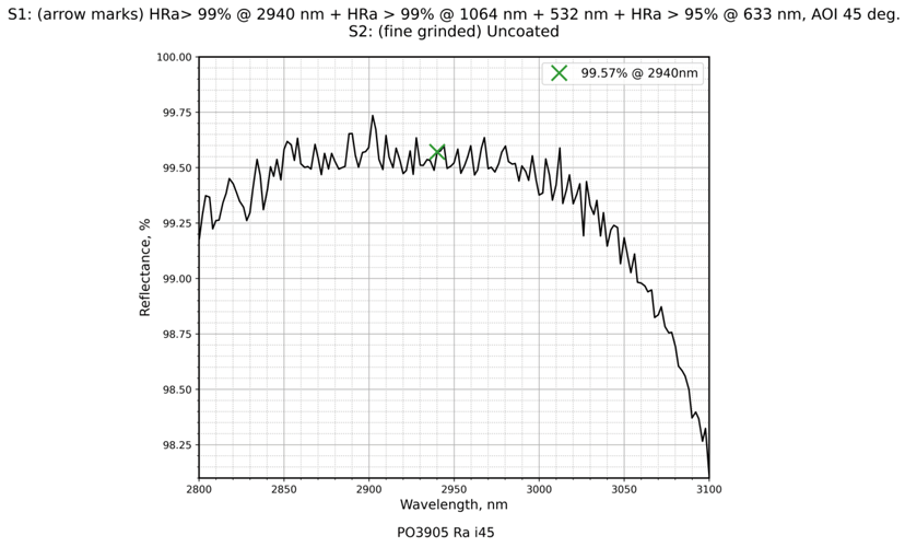 | 镀膜类型 | IBS镀膜 | 镀膜参数 | S1:HRa>99%@2940nm+HRa>98%@1064nm+HRa>94%532nm+HRa>95%@633nm / S2:Uncoated |