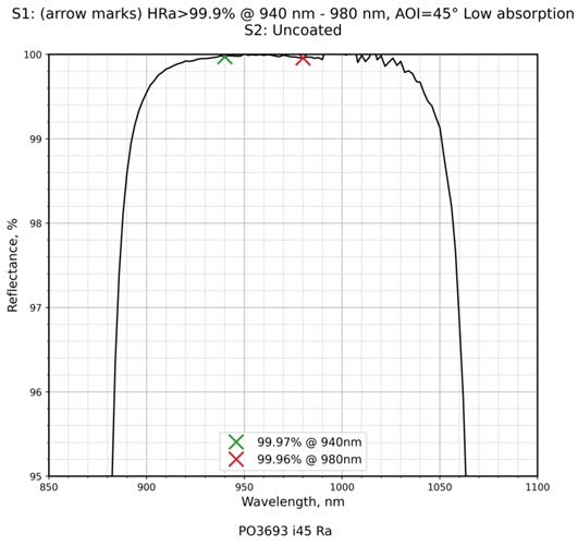 | 镀膜类型 | IBS镀膜 | 镀膜参数 | S1:HRa>99.9%@940nm-980nm / S2:Uncoated |