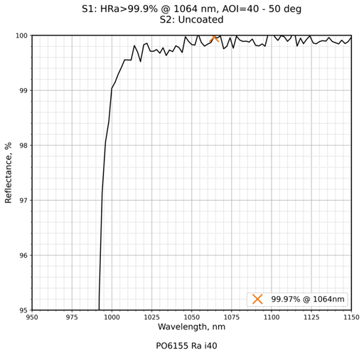 | 镀膜类型 | IBS镀膜 | 镀膜参数 | S1:HRa>99.9%@1064nm / S2:Uncoated |