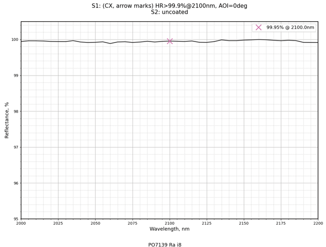 | 镀膜类型 | IBS镀膜 | 镀膜参数 | S1:HR>99.9%@2100nm / S2:Uncoated |
