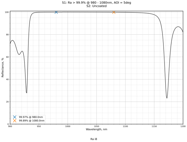 | 波长(nm) | 980 - 1080 | 表面平整度 | <λ/10@633 nm over any 8 mm diameter area | |