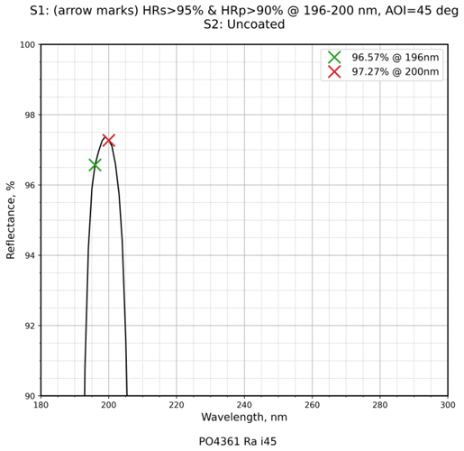 | 镀膜类型 | IBS镀膜 | 镀膜参数 | S1:HRs>95%&HRp>90%@196-200nm / S2:Uncoated |