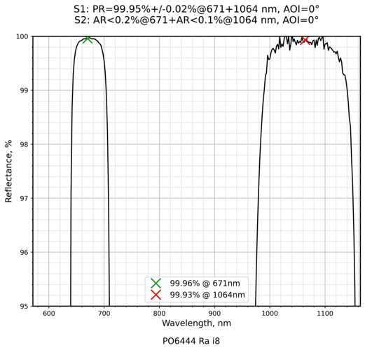 | 焦距 | -500mm | 镀膜参数 | S1:PR=99.95%+/-0.02%@671+1064nm / S2:Uncoated |