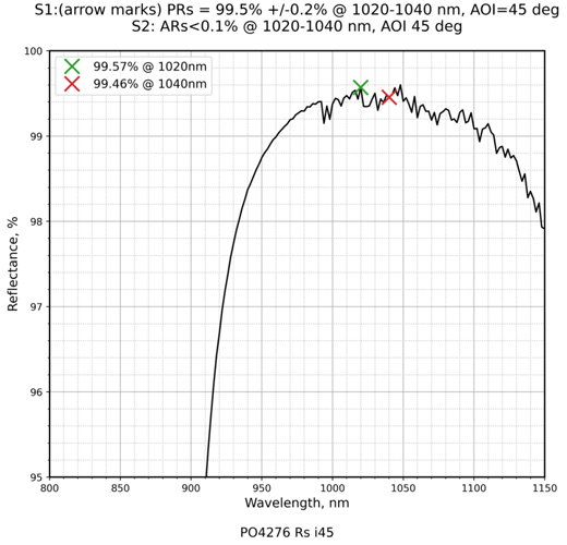 | 镀膜类型 | IBS镀膜 | 镀膜参数 | S1:PRs=99.5%+ / -0.2%@1020-1040nm / S2:ARs<0.1%@1020-1040nm |