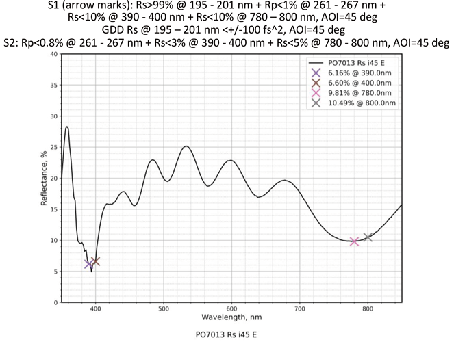 | 镀膜参数S1 | Rs>99%@195-201nm+Rp<1%@261-267nm+Rs<10%@390-400nm+Rs<10%@780-800nm | 镀膜参数S2 | Rp<0.8%@261-267nm+Rs<3%@390-400nm+Rs<5%@780-800nm |