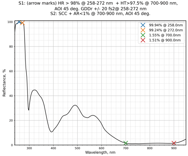 | 镀膜参数S1 | HR>98%@258-272nm,HT>97.5%@700-900nm | 镀膜参数S2 | SCC+AR<1%@700-900nm |