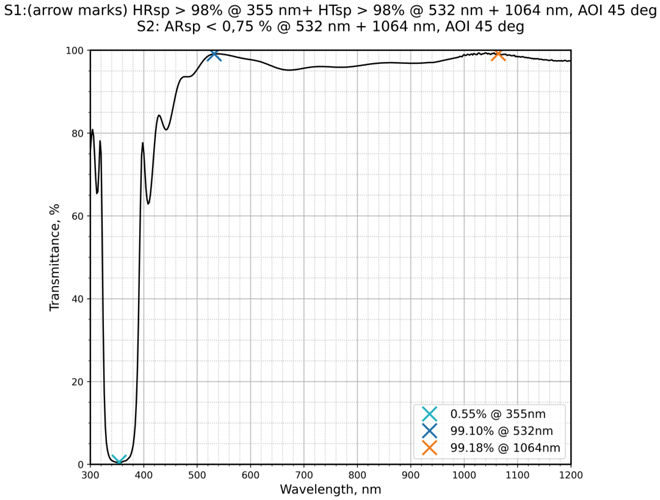 | 镀膜参数S1 | HRsp>98%@355nm+HTsp>98%@532nm+1064nm | 镀膜参数S2 | ARsp<0,75%@532nm+1064nm |