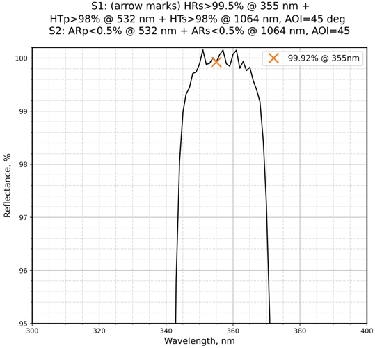 | 镀膜参数S1 | HRs>99.5%@355nm+HTp>98%@532nm+HTs>98%@1064nm | 镀膜参数S2 | ARp<0.5%@532nm+ARs<0.5%@1064nm |