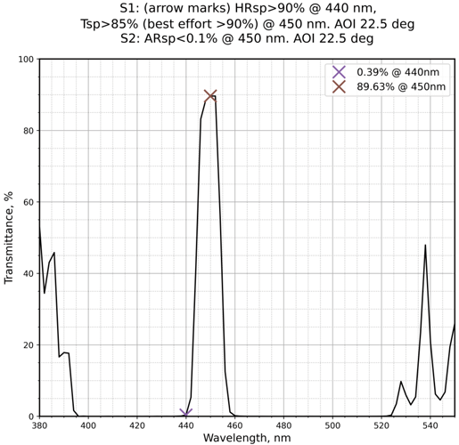 | 镀膜参数S1 | HRsp>90%@440nm,Tsp>85%(besteffort>90%)@450nm | 镀膜参数S2 | ARsp<0.1%@450nm |