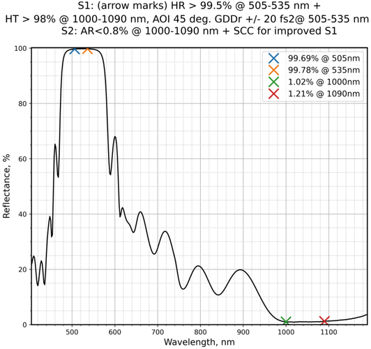 | 镀膜参数S1 | HR>99.5%@505-535nm+HT>98%@1000-1090nm | 镀膜参数S2 | AR<0.8%@1000-1090nm+SCCforimprovedS1flatness |