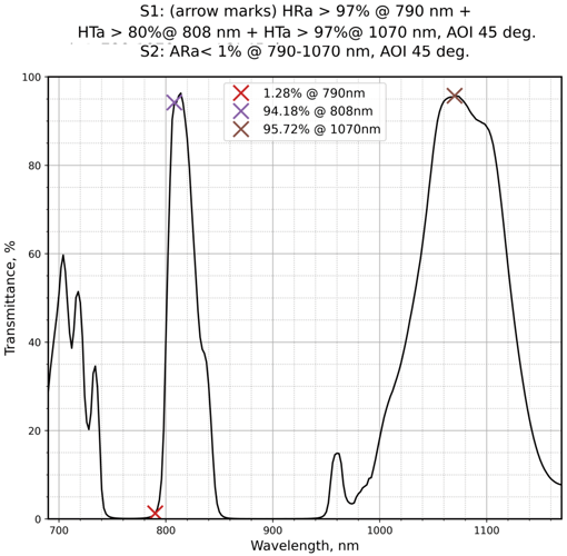 | 镀膜参数S1 | HRa>97%@790nm+HTa>80%@808nm+HTa>97%@1070nm | 镀膜参数S2 | ARa<1%@790-1070nm |