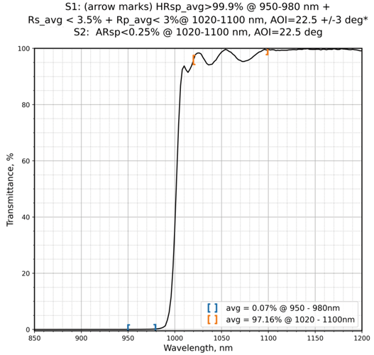 | 镀膜参数S1 | HRsp_avg>99.9%@950-980nm+Rs_avg<3.5%+Rp_avg<3%@1020-1100nm | 镀膜参数S2 | ARsp<0.25%@1020-1100nm |