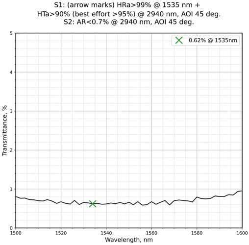 | 镀膜参数S1 | HRa>99%@1535nm+HTa>90%(besteffort>95%)@2940nm | 镀膜参数S2 | Uncoated |