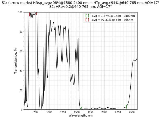 | 镀膜参数S1 | HRsp_avg>98%@1580-2400nm+HTp_avg>94%@640-765nm | 镀膜参数S2 | ARp<0.2@640-765nm |