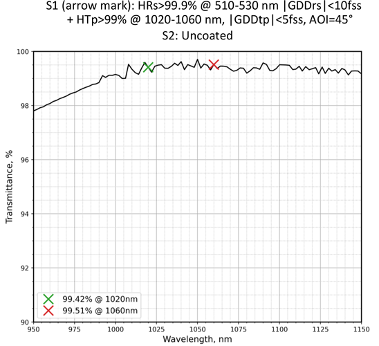 | 镀膜参数S1 | HRs>99.9%@510-530nm+HTp>99%@1020-1060nm,AOI=45° | 镀膜参数S2 | Uncoated |