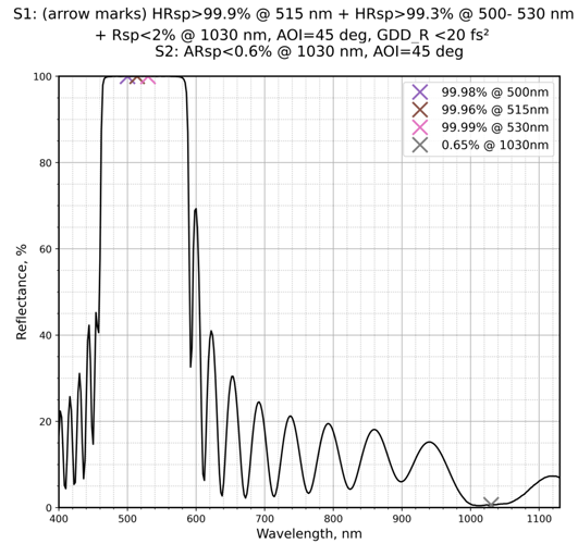 | 镀膜参数S1 | HRsp>99.9%@515nm+HRsp>99.3%@500-530nm+Rsp<2%@1030nm | 镀膜参数S2 | ARsp<0.6%@1030nm |