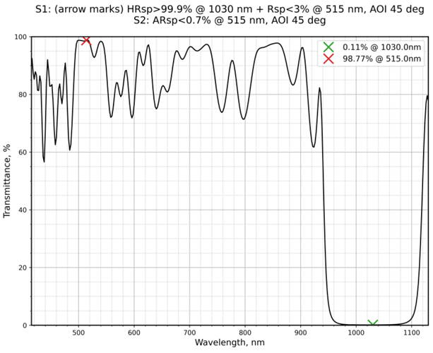 | 镀膜参数S1 | HRsp>99.9%@1030nm+Rsp<3%@515nm | 镀膜参数S2 | ARsp<0.7%@515nm |