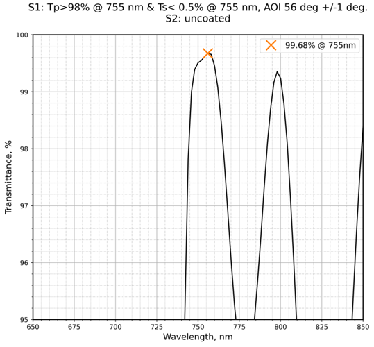 | 镀膜类型 | IBS偏振镀膜 | 镀膜参数S1 | Ts<0.5%@755nm+Tp>98%@755nm | |