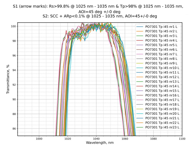 | 镀膜类型 | IBS偏振/增透镀膜 | 镀膜参数S1 | Rs>99.8%@1025nm-1035nm&Tp>98%@1025nm-1035nm | |