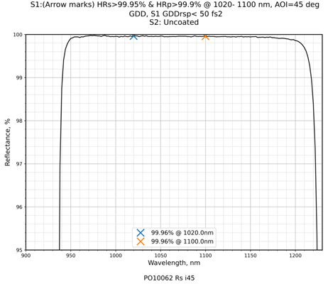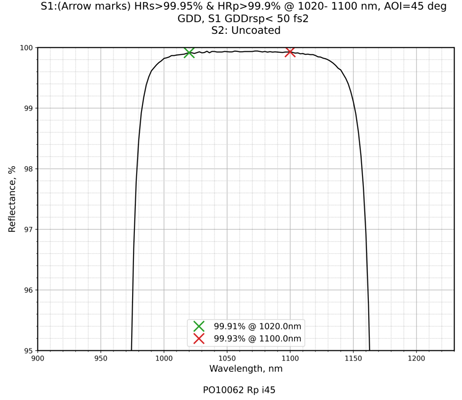 | 镀膜类型 | IBS镀膜 | 镀膜参数 | S1:HRs>99.95%&HRp>99.9%@1020-1100nm / S2:Uncoated |