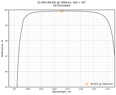 | 镀膜类型 | IBS镀膜 | 镀膜参数 | S1:HR>99.9%@1064nm / S2:Uncoated |