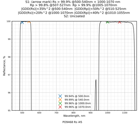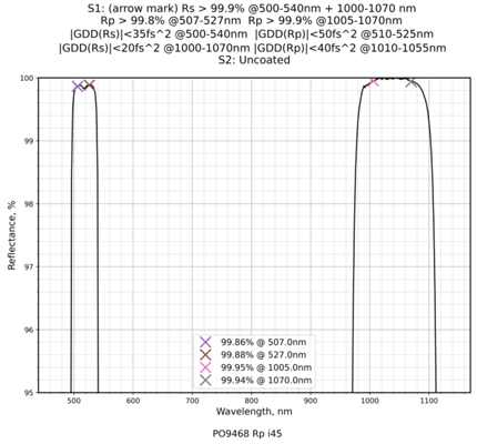 | 镀膜类型 | IBS镀膜 | 镀膜参数 | S1:Rs>99.9%@500-540nm+1000-1070nm,Rp>99.8%@507-527nm,Rp>99.9%@1005-1070nm / S2: SCC |
