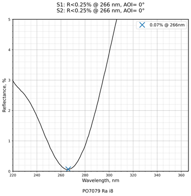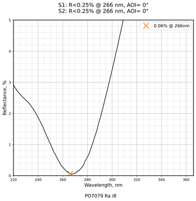| 镀膜参数 | S1: R<0.25%@266nm / S2: R<0.25%@266nm | |||