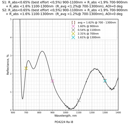 | 镀膜参数 | S1:R_abs<0.65%(best effort <0,5%)900-1100nm+R_abs<1.9%700-900nm+R_abs<1.6%1100-1300nm,R_avg<1.2%@700-1300nm / S2:R_abs<0.65%(best effort <0,5%)900-1100nm+R_abs<1.9%700-900nm+R_abs<1.6%1100-1300nm,R_avg<1.2%@700-1300nm | |||