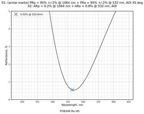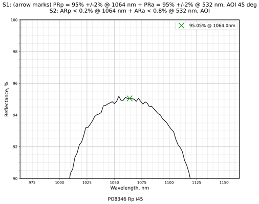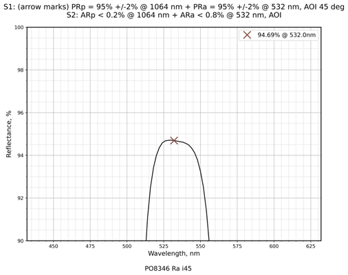 | 镀膜类型 | IBS镀膜 | 镀膜参数 | S1:PRp=95%+ / -2%@1064nm+PRa=95%+ / -2%@532nm / S2:ARp<0.2%@1064nm+ARa<0.8%@532nm |