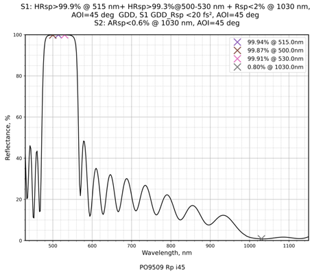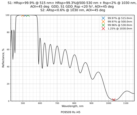 | 镀膜参数S1 | HRsp>99.9%@515nm+HRsp>99.3%@500-530nm+Rsp<2%@1030nm | 镀膜参数S2 | ARsp<0.6%@1030nm |