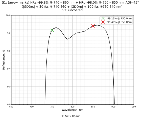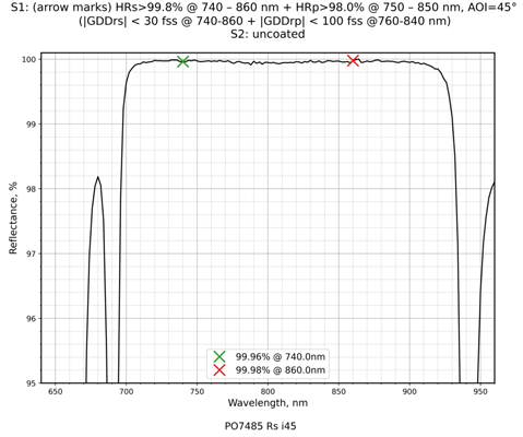 | 镀膜类型 | IBS镀膜 | 镀膜参数 | S1:HRs>99.8%@740-860nm+HRp>98.0%@750-850nm / S2:Uncoated |