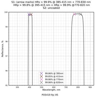 | 镀膜类型 | IBS镀膜 | 镀膜参数 | S1:HRs>99.9%@385-415nm+770-830nm,HRp>99.8%@395-415nm+HRp>99.9%@770-820nm / S2:Uncoated |