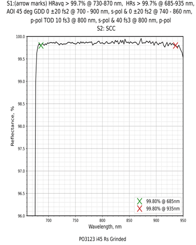 | Coating Type | IBS | Coating Specifications | S1:HRavg>99.7%@730-870nm,HRs>99.7%@685-935nm / S2:SCC |