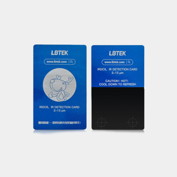 Suitable for wavelengths from 2–13 μm, with an activation temperature above 30 °C. This card uses a thermo-sensitive film that absorbs mid-infrared radiation and converts it into heat, causing the film to change color for direct visual observation. The card is built on an aluminum alloy substrate for efficient heat dissipation, and the sensing area is marked with a crosshair and concentric circles (8 mm inner diameter) to assist with precise beam alignment.