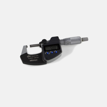 Measuring range: 0–25 mm, with accuracy up to ±0.002 mm and resolution of 0.001 mm. This precision micrometer features a linear-encoded digital display, metric units, and a locking screw to secure the spindle position. The measuring faces are made of hard alloy, and the device is a ball–flat type digital micrometer with IP65 protection rating. Equipped with a constant measuring force mechanism, it can precisely measure the thickness of nearly all materials with high repeatability.