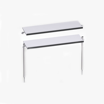 The shelf height can be adjusted to suit user needs. Once the desired height is set, the clamps can be tightened with a wrench to secure the panel, allowing the shelf to evenly support up to 50 kg. The 12° downward tilt improves visibility and accessibility in the lab. The 20 mm raised edge prevents equipment from sliding off the panel. If you prefer 1000 mm mounting rods (SW-EB100) instead of the included 750 mm rods, they can be purchased separately from the LBTEK website.