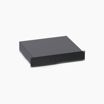 The 19-inch rackmount drawer features a black painted exterior, damping slide rails for smooth pull-out operation, and a built-in mechanical lock for added security.