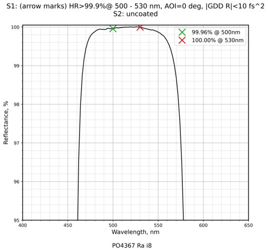 | 镀膜类型 | IBS镀膜 | 镀膜参数 | S1:HR>99.9%@500-530nm / S2:Uncoated |