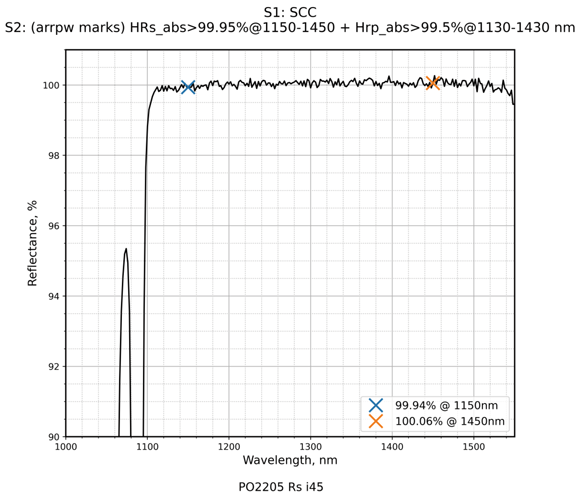 | 镀膜类型 | IBS镀膜 | 镀膜参数 | S1:SCC / S2:HRs_abs>99.95%@1150-1450nm+HRp_abs>99.5%@1170-1430nm |