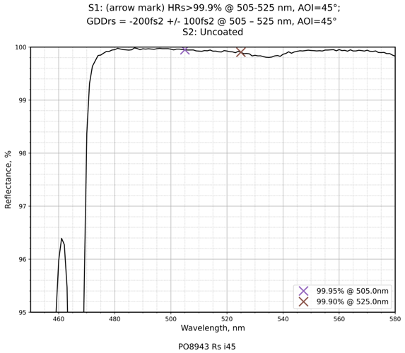 | 入射角度(°) | 45 | 镀膜参数 | S1:HRs>99.9% @ 505-525 nm / S2:Uncoated |