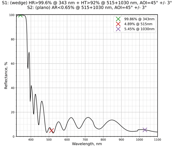 | 镀膜参数S1 | HR>99.6%@343nm+HT>92%@515+1030nm | 镀膜参数S2 | AR<0.65%@515+1030nm |