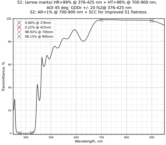 | 镀膜参数S1 | HR>99%@376-425nm+HT>98%@700-900nm | 镀膜参数S2 | AR<1%@700-900nm+SCCforimprovedS1flatness |