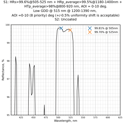 | HR波长(nm) | 505 - 525 | HT波长(nm) | 800 - 920 + 1180 - 1400 | |