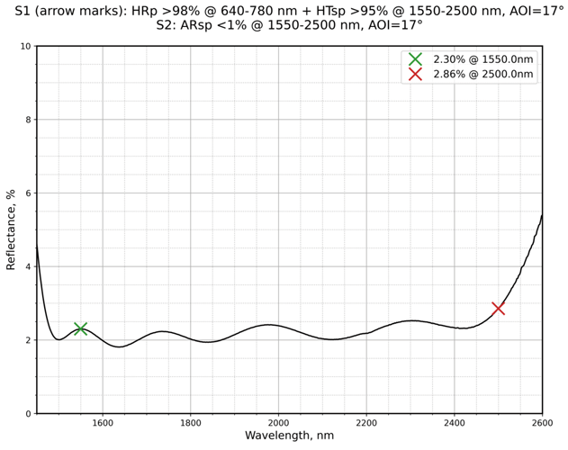 | 镀膜参数S1 | HRp>98%@635-780nm+HTsp>95%@1550-2500nm | 镀膜参数S2 | ARsp<1%@1550-2500nm |