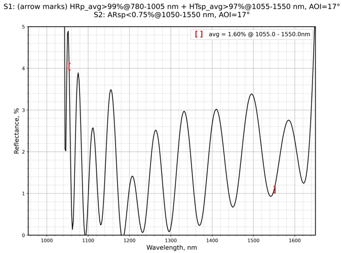 | 镀膜参数S1 | HRp_avg>99%@780-1005nm+HTsp_avg>97%@1055-1550 | 镀膜参数S2 | ARsp<0.75%@1050-1550nm |