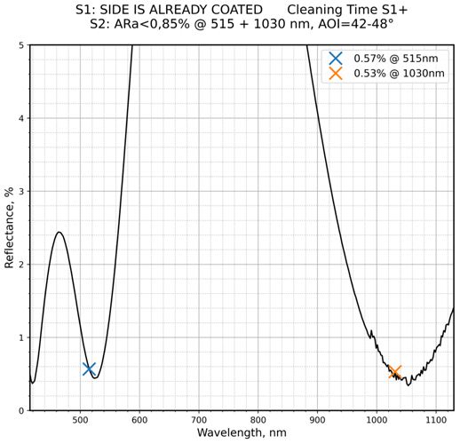 | 镀膜参数S1 | HRa>99.5%@260nm+HTa>92%@515+1030nm | 镀膜参数S2 | ARa<0.85%@515+1030nm |