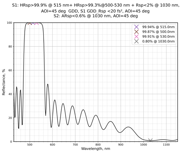 | 镀膜参数S1 | HRsp>99.3%@500-530nm+Rsp<2%@1030nm | 镀膜参数S2 | ARsp<0.6%@1030nm |