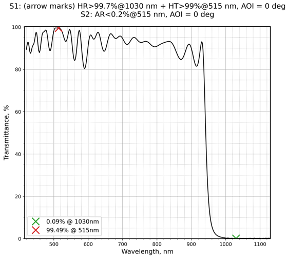 | 镀膜参数S1 | HR>99.7%@1030nm+HT>99%@515nm | 镀膜参数S2 | AR<0.2%@515nm |