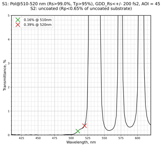 | 镀膜类型 | IBS偏振镀膜 | 镀膜参数S1 | Pol@510-520nm(Rs>99.0%,Tp>95%) | |